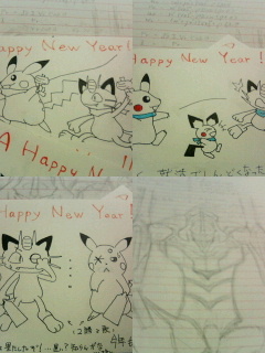 えー…。 明けましておめでとうございました。 今日は…いや、昨日は年賀状書いてました。(今更かよ!) 今年はネズミ年なのでネズミと言ったら「やっぱ電気ネズミだろう!」ってな訳でピカチュウを書きました。 ていうか、年賀状を書いたの久しぶりです。近年はずっとメールで済ましてましたから。 おかげで自分の郵便番号を間違えそうになりました。忘れかけてました。(忘れるなよ) ま、久々に年賀状を出すって言っても三人だけなんですけどね! その、たった三枚しか描いてない(しかも、色ナシ)のに何故かテンションが高くなり、ついでに初号機も描きました。 今年も初号機描きます! やっぱ初号機描くの楽しいー!つーか、初号機スキー。 破が見たいー。早く見たいー。 PR